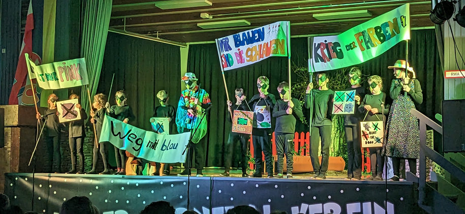Mit ein paar alten Hasen und vielen neuen Gesichtern gab es für unsere Kindertheatergruppe im April 2022 einen Neustart. Klar war jedoch, dass die Laienspielgruppe in diesem Jahr keine große Produktion mit den Kindern auf die Bühne bringen kann. Zu groß wären das finanzielle und auch das emotionale Risiko gewesen, dass die Aufführungen im Winter coronabedingt wieder abgesagt hätten werden müssen. Daher entschieden wir uns für ein kleineres Spielprojekt, welches besonders den Neuen in der Gruppe die Möglichkeit geben sollte, in das Theaterspielen reinzuschnuppern. Als Spielvorlage nahmen wir das Bilderbuch „Als die Raben noch bunt waren“. Gemeinsam mit den Kindern entwickelten wir verschiedene Tierfiguren und übten uns im körperlichen Ausdruck. Außerdem entwickelten wir fünf Szenen zu der Geschichte. Musik, Choreographien, Dialoge - alles selbst entwickelt durch viel ausprobieren und improvisieren. Sogar die Masken und einige Requisiten wurden von den Kindern selbst gebastelt und gestaltet. So entstand innerhalb von nur 7 Monaten mit einer neuen Truppe eine kleine, kreative und kunterbunte Stückentwicklung. Super stolz präsentieren wir am