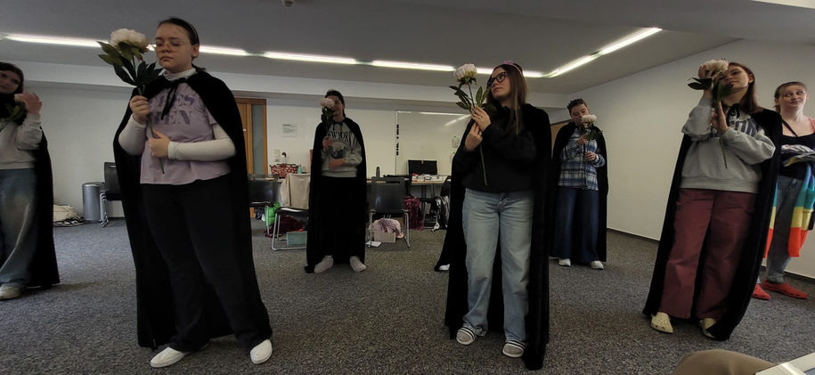 Wir starteten mit einem ausführlichen Warm-Up. Dadurch wurden wir wach und konzentriert. Unser Plan war es, nun den dritten Akt dramaturgisch fertig zu stellen und die Szenen anzulegen. Dazu sahen wir uns zunächst die Handlungsstränge im Stück genauer an. Wir überlegten, wie die einzelnen Handlungsstränge miteinander zusammenhängen und wie wir diese nicht ins Leere laufen lassen, sondern im 3. Akt zu Ende erzählen können. Wie sollte das Stück für die einzelnen Figuren ausgehen? Wie sollten die Konflikte gelöst werden? Alle brachten ihre Ideen ein und die Entscheidungen wurden gemeinsam getroffen. Nach dieser Arbeit an der Dramaturgie des Stücks fingen wir an, die Szenen des 3. Akts anzuspielen. Als Erstes bildeten wir mehrere Gruppen, um gleichzeitig an verschiedenen Szenen arbeiten zu können. Nachdem wir uns die erarbeiteten Szenen einander präsentiert hatten, gingen wir auch schon zum Mittagessen. Nach der Stärkung studierten die Prinzessinnen den zweiten Tanz ein. Anschließend wollten wir alle erarbeiteten Teile an einem Stück sehen. Dann folgten wieder Gruppenarbeiten. Einige arbeiteten an Improvisation andere an ihrer Rolle. Nach einer weiteren Ergebnisvorstellung spielten wir die erarbeiteten Szenen erneut am Stück durch. Raumwege wurden festgelegt. Das Spiel mit den Requisiten wurde eingebaut Nach diesem erfolgreichen Probetag gönnten wir uns auch ein wenig Entspannung am Abend. Manche gingen schon ins Bett, um für den nächsten Tag wieder volle Energie zu haben. Andere schauten den passenden Film zu unserem Stück. Das war ein sehr süßer Abend mit wunderschöner Stimmung. Der Tag war unfassbar erfolgreich und jedes Mal, wenn einen Haken hinter einer fertigen Szene setzten konnten, waren wir so glücklich und stolz.